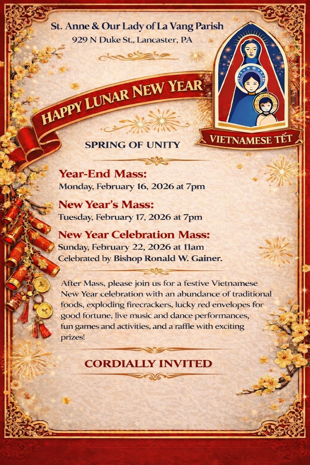 11:00 pm Mass to be celebrated by Bishop Gainer in English; Readings and music will be in Vietnamese.